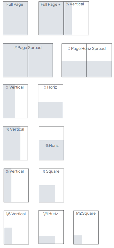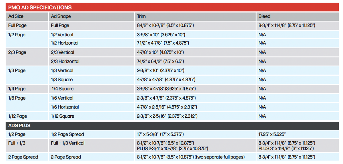 Keep all live items (not intended to trim) 1/2” inside trim edges. If an ad is designed to bleed to the edge, an 1/8” bleed is required outside of trim. Please make sure to output the pdf accordingly to include the bleed, as this is generally not the default setting. Two-page spreads must be created as two separate full page PDFs.